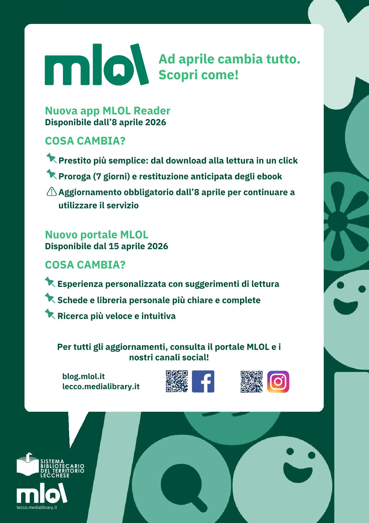Dal 8 aprile 2026 sarà possibile scaricare l'app MLOL per il prestito libri del sistema bibliotecario in versione ancora più aggiornata e dal 15 aprile 2026 sarà pubblicato il nuovo sito per gli utenti.