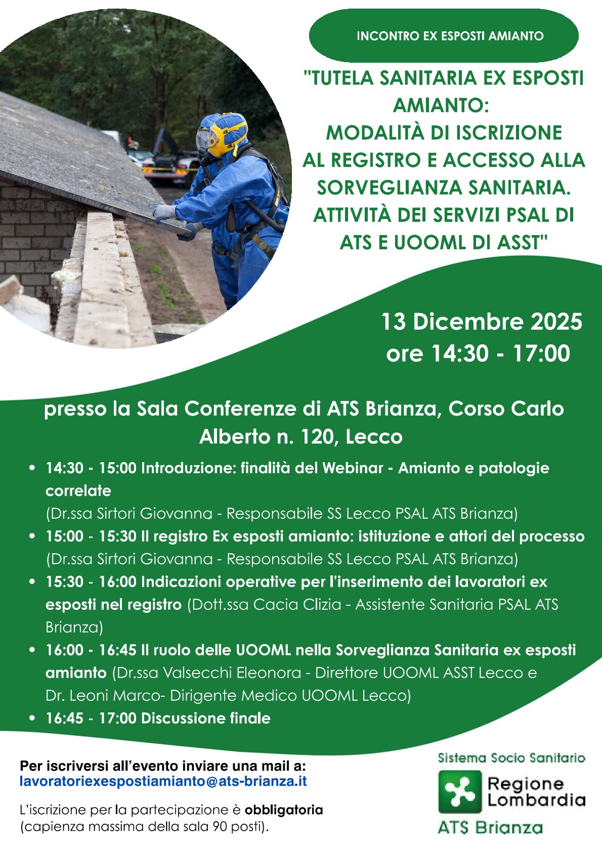 ATS Brianza orgnanizza un incontro per tutti gli ex esposti all'amianto per l'iscrizione al registro di sorveglianza sanitaria