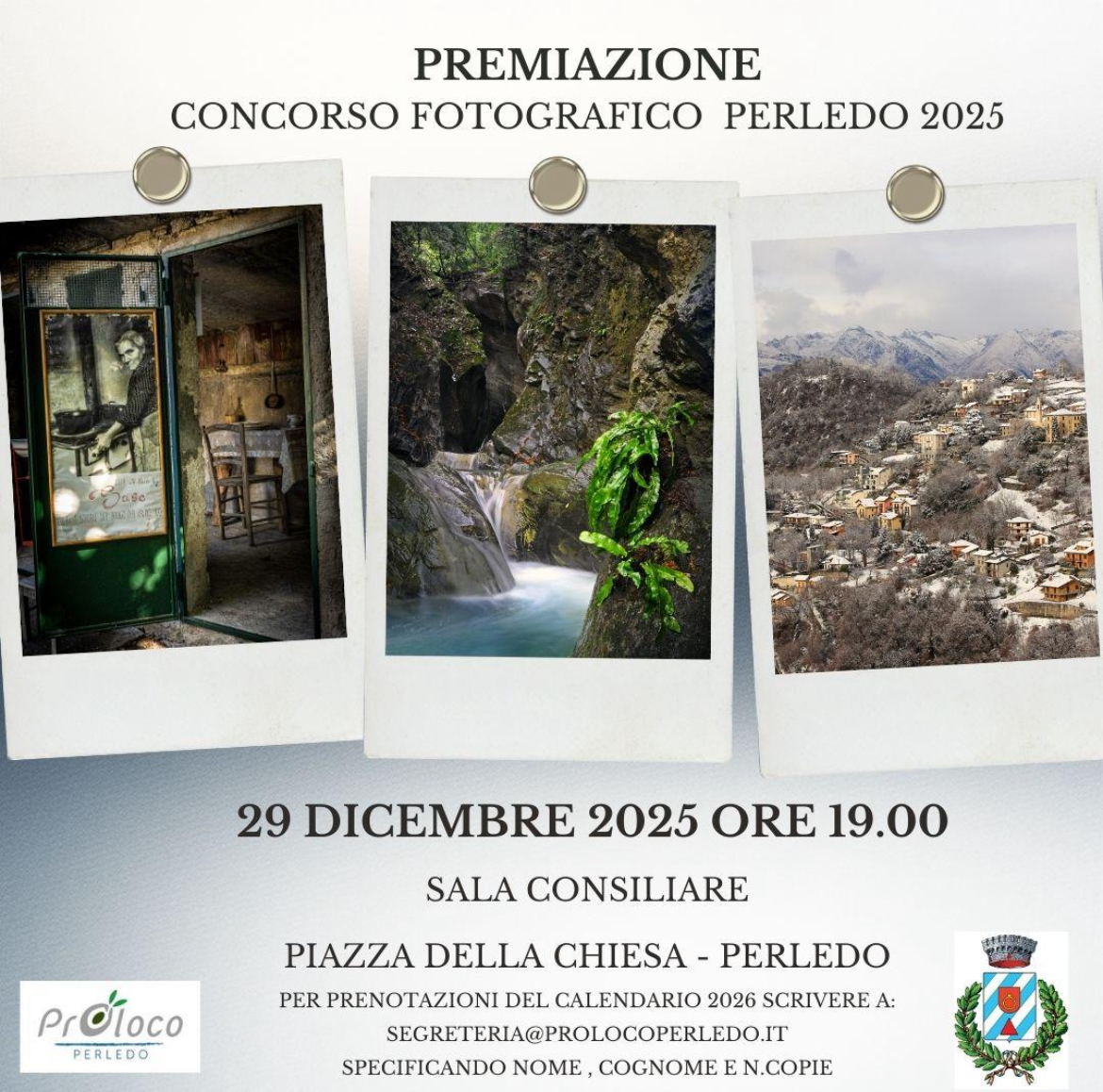 Lunedì 29 dicembre 2025 presso la sala consiliare, dopo il concerto di Natale, avrà luogo la premiazione del concorso fotografico 2025 organizzato dalla Pro Loco di Perledo.